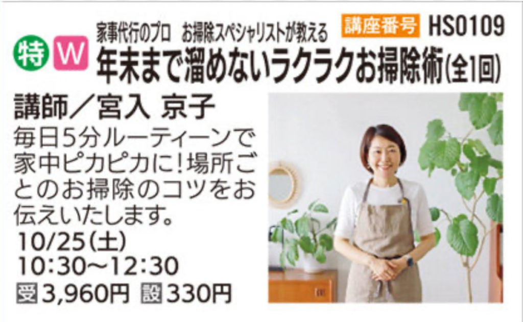 お掃除のシーズンが近づくこの秋、いつもお世話になっているアリオ橋本セブンカルチャークラブ様からご依頼をいただき、「年末まで溜めないラクラクお掃除術」というテーマで講座を開催しました。当日は7名の方が参加してくださり、笑い声も交えながら和やかで楽しい講座となりました。
