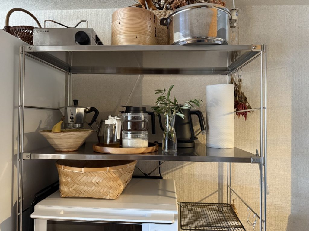 無印ステンレスシェルフにはペーパータオルロールを置きっぱなし